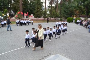 Sonda məktəbin birinciləri ilk zəngi çalaraq sinif otaqlarına daxil olub, yeni dərs ili üçün ilk dərs başlayıb.