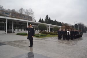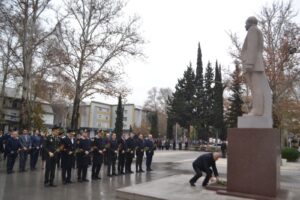 Daha sonra iştirakçılar Heydər Əliyev Meydanına yürüş edərək burada ucaldılmış abidənin önünə tər çiçəklər qoyublar. Mərasim iştirakçıları Ulu Öndərin əziz xatirəsini ehtiramla yad edib, bir dəqiqəlik sükutla onun müqəddəs ruhunu anıblar.